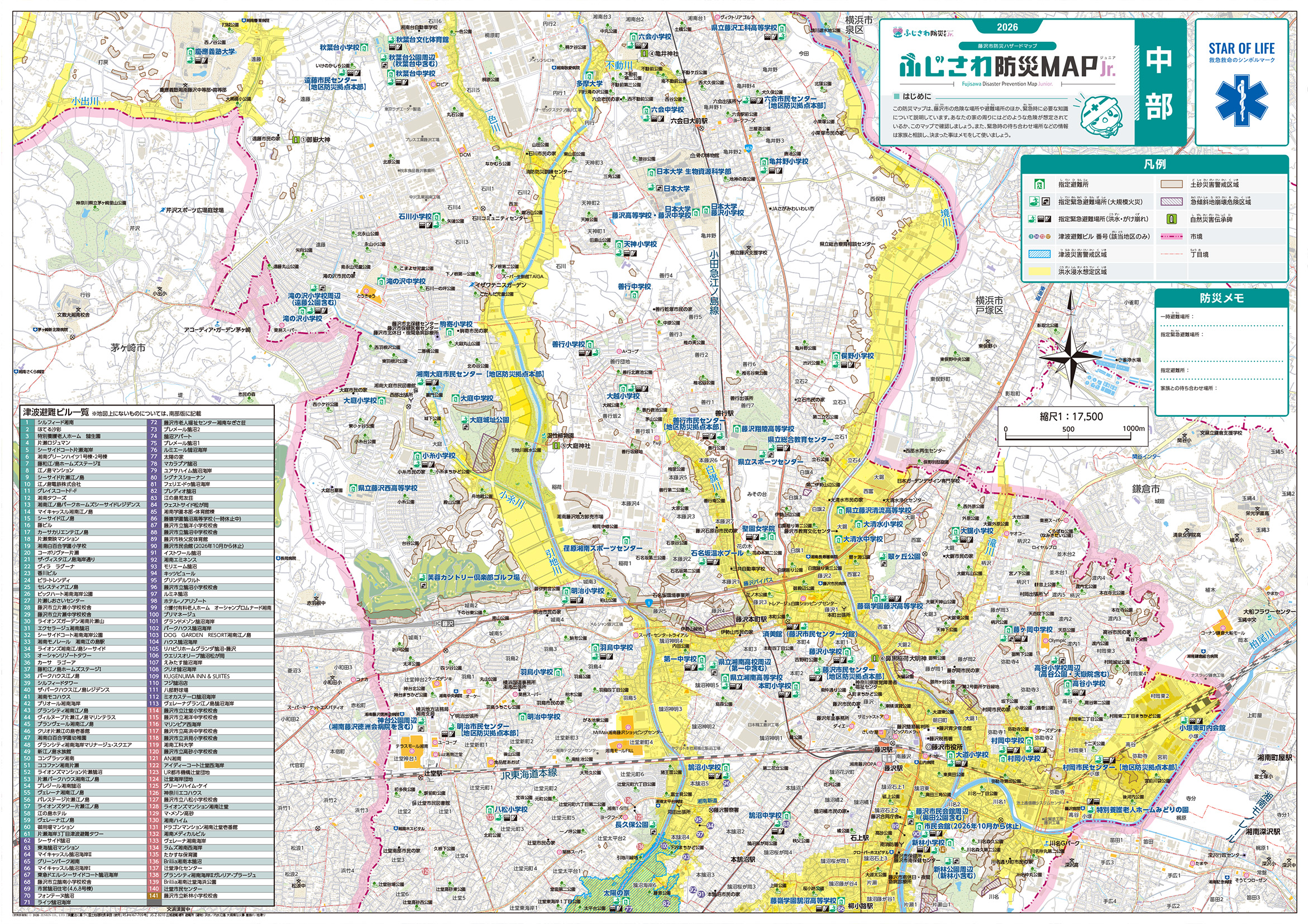 ハザードマップ(ふじさわ防災ナビジュニアマップ)には、避難所や災害の危険が高い地域などが掲載されています。