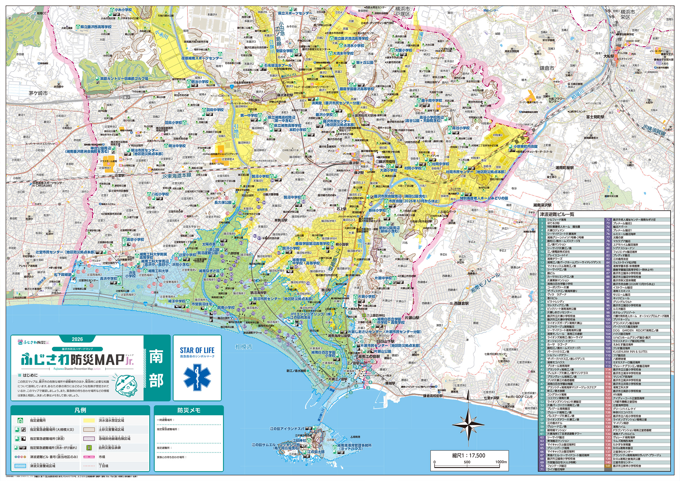 ハザードマップ(ふじさわ防災ナビジュニアマップ)には、避難所や災害の危険が高い地域などが掲載されています。